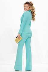 Giacca doppiopetto in cady verde acqua. Taglio regolare e avvitato con chiusura a quattro bottoni rivestiti, maniche tubolari, ampio collo a revers a specchio e tasche frontali a filo.