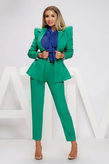Giacca verde acqua con spalline appuntite, collo a revers e sciallato. Le spalline a punta le conferiscono un aspetto strutturato e originale.