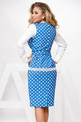 Gilet di colore azzurro fantasia pois. Linea sagomata con chiusura a due bottoni a vista e fondo, svasato con pinces, impreziosito da bordura in pizzo bianco. Cintura dello stesso tessuto, da annodare.