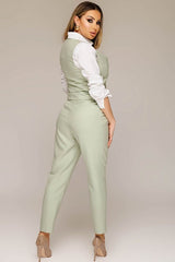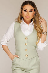 Scopri il nostro gilet sartoriale in verde menta con raffinata fantasia a righe sottili. I bottoni dorati donano un tocco lussuoso, mentre il taglio aderente esalta la silhouette. Perfetto da abbinare a camicie bianche o pantaloni coordinati per un look chic da ufficio o eventi eleganti. Fresco, moderno e incredibilmente versatile: un must-have per la donna contemporanea.