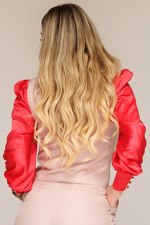 Scopri il nostro gilet sartoriale in rosa con raffinata fantasia a righe sottili. I bottoni dorati donano un tocco lussuoso, mentre il taglio aderente esalta la silhouette. Perfetto da abbinare a camicie bianche o pantaloni coordinati per un look chic da ufficio o eventi eleganti. Fresco, moderno e incredibilmente versatile: un must-have per la donna contemporanea.