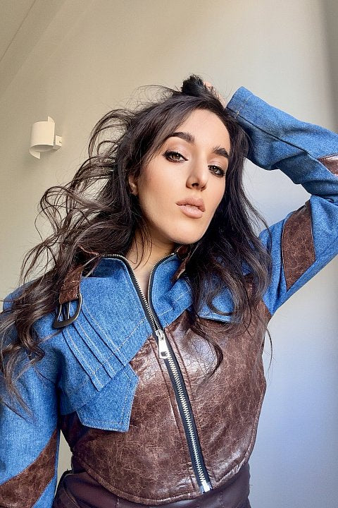 Giubbino corto di jeans con inserti in ecopelle marrone, chiusura tramite zip sul davanti.
