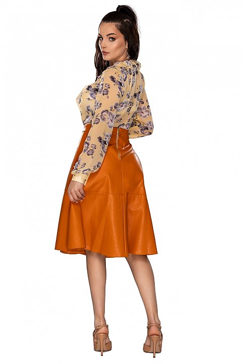 Gonna midi elegante a ruota, realizzata in pelle sintetica, ideale per l'ufficio.