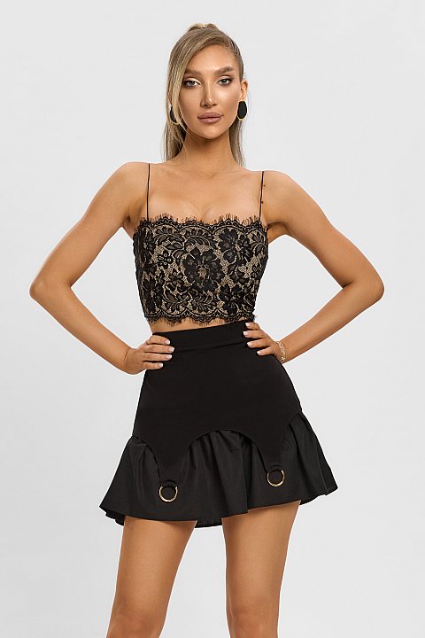 Aggiungi un tocco di carattere al tuo outfit con questa elegante gonna mini nera. Il design a vita alta slancia la silhouette, mentre la balza con dettagli ad anello dorati regala un tocco glamour e originale. Perfetta per la sera o un'occasione speciale, si abbina alla perfezione con un top in pizzo o un corsetto per un look irresistibile. Realizzata con materiali di qualità, garantisce comfort e vestibilità impeccabile.