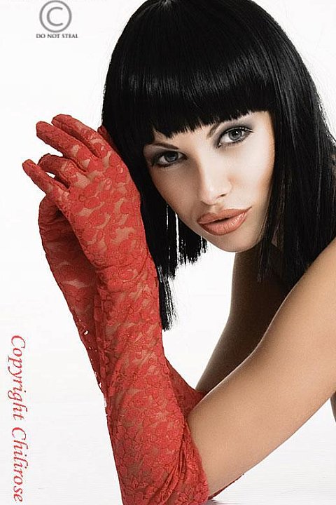 Guanti lunghi fino al gomito in pizzo lavorato motivo floreale. Colore rosso. Taglia unica.