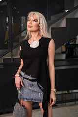 Maglia a mezze maniche con orlo asimmetrico e strascico laterale accessoriata con fiore 3d.