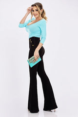 Blusa casual blu menta con maniche a tre quarti. La blusa ha uno scollo tondo ed è perfetta per l'ufficio.