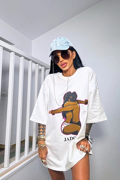Maglia lunga oversize con stampa Uomo & Donna sul davanti (la modella indossa la taglia S, ma la maglia è di taglia L).