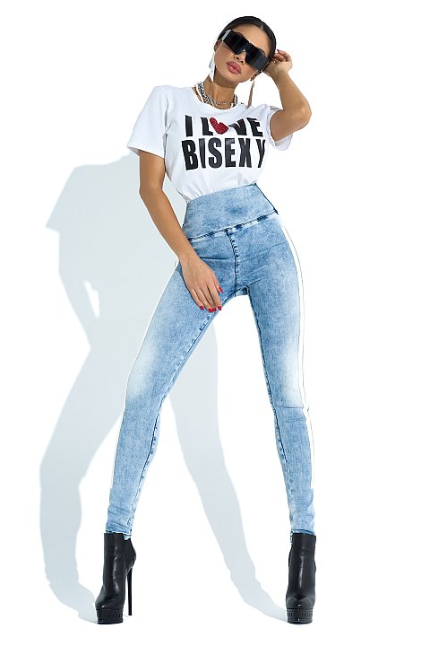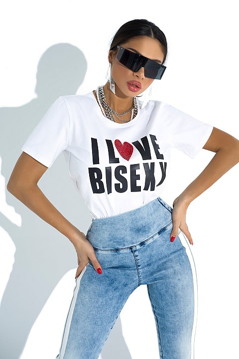 Moderna t-shirt bianca con stampa messaggio e strass applicati. Con scollo tondo.