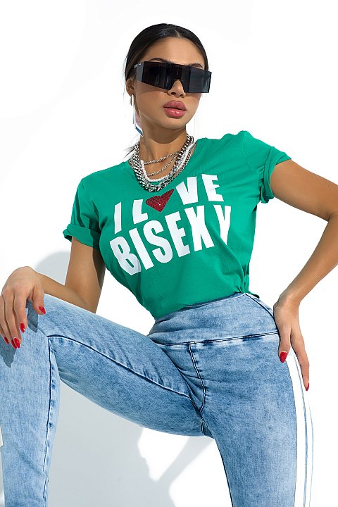 Moderna t-shirt verde con stampa messaggio e strass applicati. Con scollo tondo.