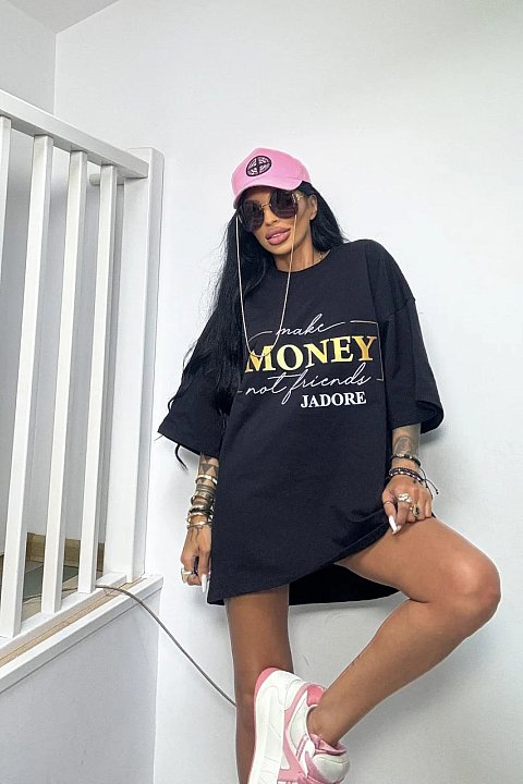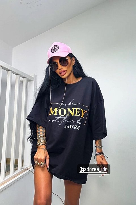 Maglia lunga oversize con stampa "Money" sul davanti (la modella indossa la taglia S, ma la maglia è di taglia L).