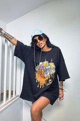 Maglia lunga oversize con stampa Soldi sul davanti (la modella indossa la taglia S, ma la maglia è di taglia L).