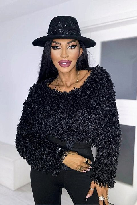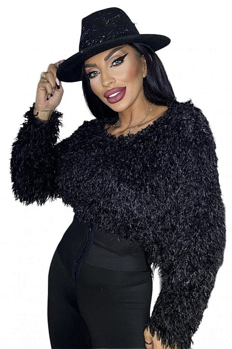 Maglioncino corto con piume abbinabile con un pantalone od una gonna a vita alta.