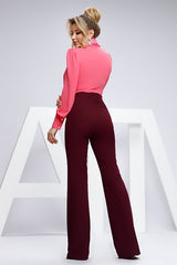 Pantaloni svasati in velluto bordeaux vita alta facilmente abbinabili.