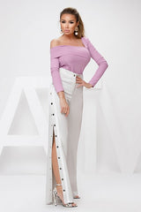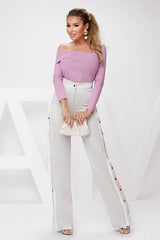 Pantalone a zampa di colore argento con dettagli in bianco. Modello a vita alta con sinuosità sui fianchi e svasatura graduale lungo la gamba caratterizzata da bottoncini automatici, posti all'esterno, per regolare la desiderata apertura.