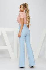 Pantalone trendy azzurro a zampa di elefante con vita alta e tasche. può essere indossato con qualsiasi tipo di camicia o body.