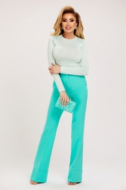 pantaloni turchesi aderenti. Ideale per eventi formali o serate glamour, questo look mette in risalto lo stile sofisticato e moderno, perfetto per chi cerca un abbigliamento chic e alla moda.