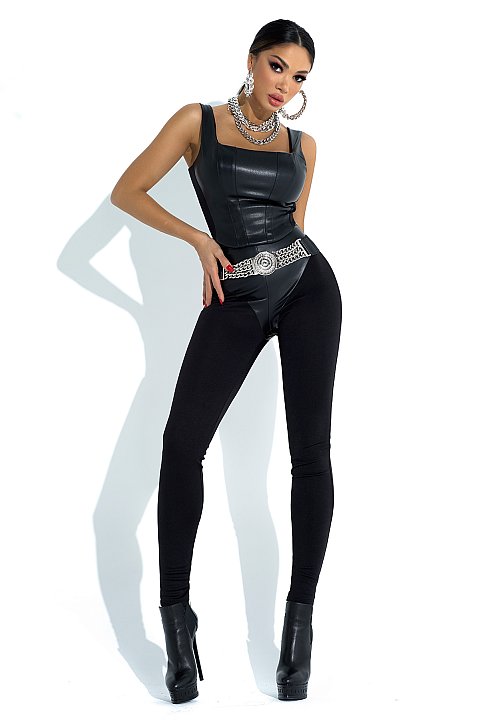 Pantaloni a vita alta che hanno uno slip in pelle ecologica, e in vita sono accessoriati con una cintura a catena.