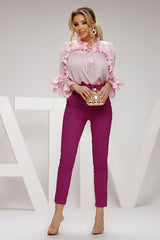 Pantalone a coste viola sono pantaloni facilmente indossabili in ufficio grazie al taglio che permette di abbinarli a qualsiasi tipo di camicia o blusa. I pantaloni possono essere indossati anche durante le uscite in club o possono essere indossati in abiti casual.
