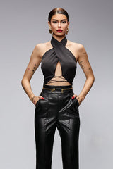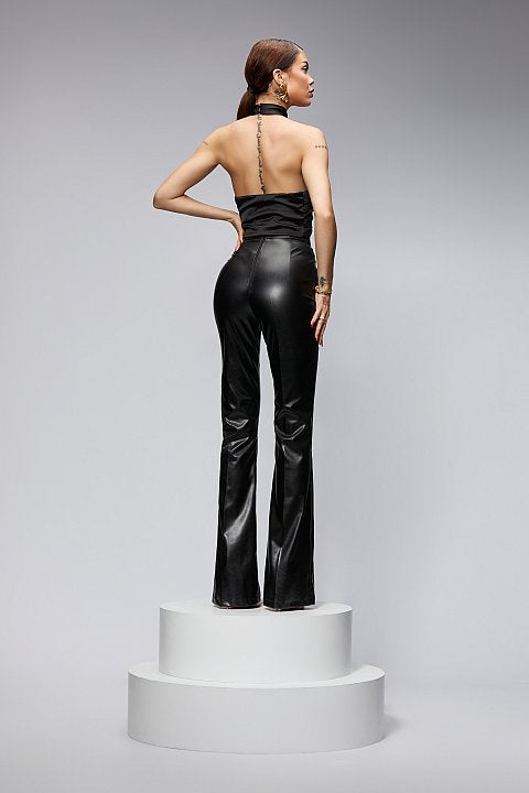 Pantaloni a palazzo in ecopelle con dettaglio cerniere in vita e zip sexy sul lato B.