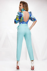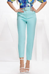 Pantalone capri in cady verde acqua con cintura. Punto vita alto e gamba a sigaretta, tasche a uomo, pinces e chiusura frontale nascosta.
