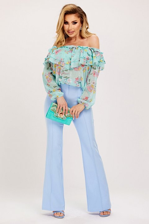 Pantaloni a zampa d'elefante conferiscono un tocco vintage e allungano visivamente la figura. La combinazione di colori pastello, con il verde acqua della blusa e l'azzurro dei pantaloni, crea un look fresco e delicato, ideale per eventi all'aperto o occasioni eleganti ma informali.