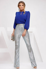Pantaloni a zampa, completamente decorati da paillettes argentate, donano un effetto scintillante e sofisticato. Perfetto per le serate più speciali, questo outfit unisce comfort e stile per farti risplendere.
