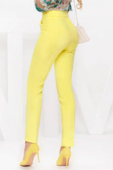 Pantalone a sigaretta giallo chiaro. Modello a vita alta con chiusura totalmente nascosta, tasche a filo laterali e gamba dritta con lunghezza a caviglia. Realizzato in cady di cotone appena elasticizzato.