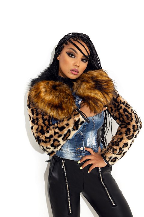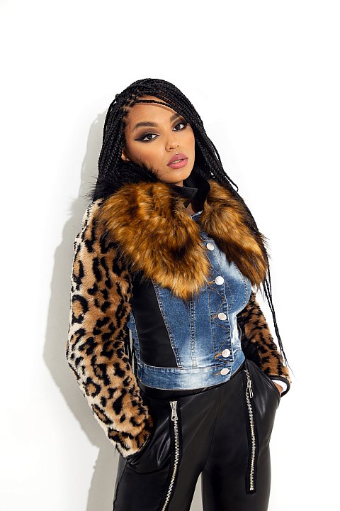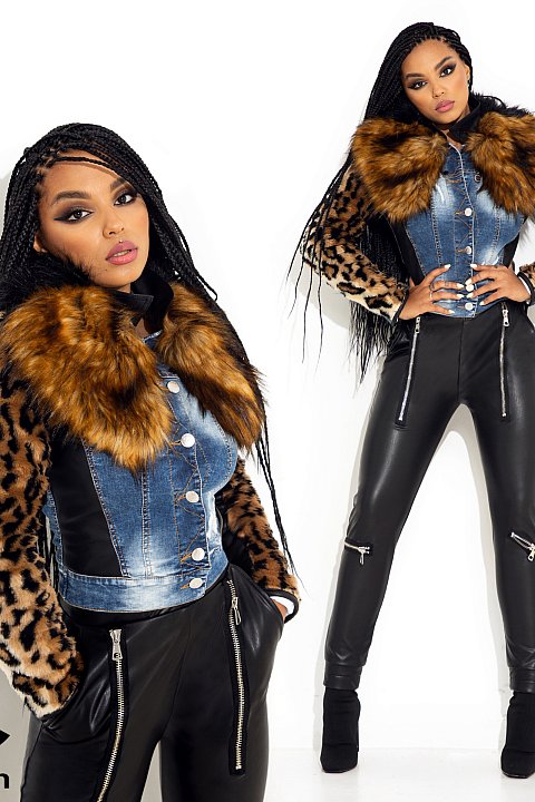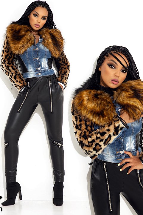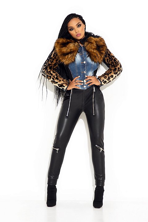 Pantalone in ecopelle di colore nero. Modello aderente a vita alta e gamba affusolata chiusa da fascia. Tasche a uomo e zip metalliche, decorative.