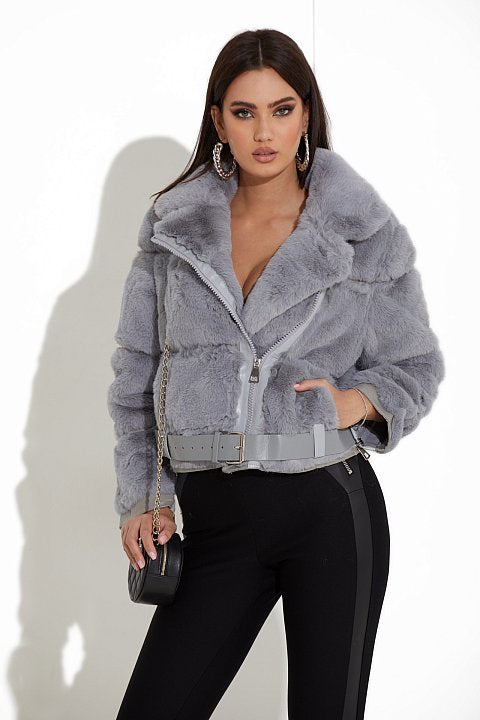 Giubbotto in pelliccia ecologica con cerniera in diagonale, vestibilità comoda.