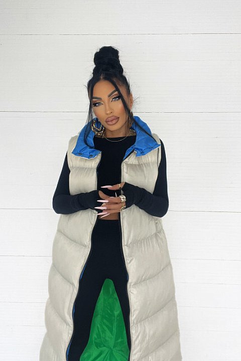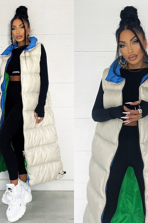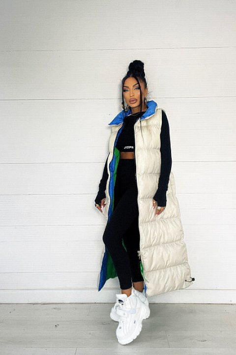 Piumino lungo fino ai piedi con imbottitura, di color bianco con fodera interna verde e colletto azzurro. Smanicato e con chiusura con cerniera frontale.
