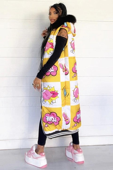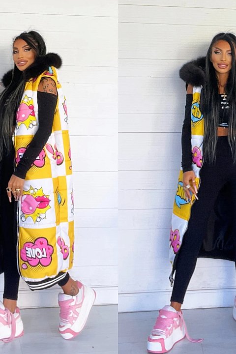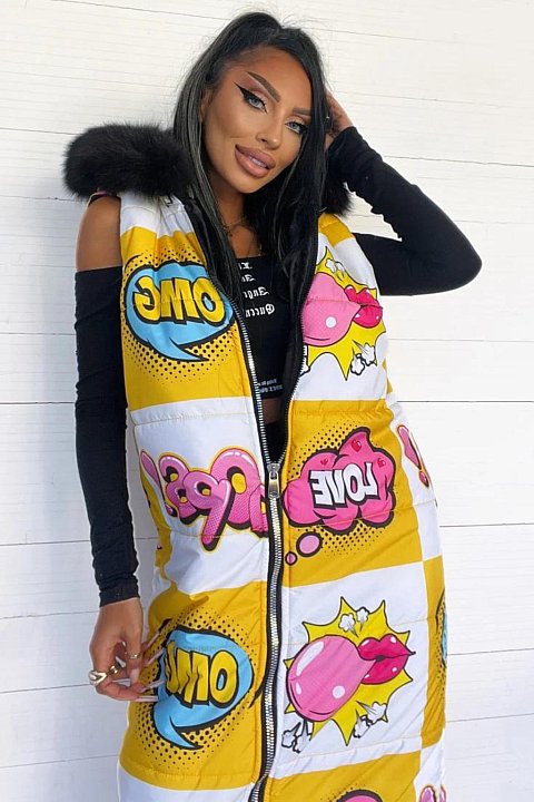 Piumino smanicato con fumetti ed eco pelliccia