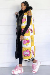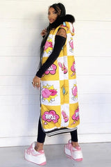 Piumino smanicato lungo fino ai piedi con imbottitura, con stampa fumetti e cappuccio accessoriato con eco pelliccia.