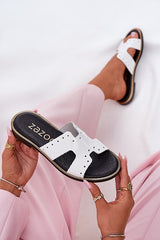 Questi sandali sono il perfetto mix tra comodità e stile. Con tomaia bianca effetto lucido e tagli geometrici, si distinguono per il profilo impreziosito da micro borchie dorate che donano un tocco glam al design minimal. Facili da indossare grazie alla forma slip-on, sono ideali per accompagnare outfit casual, estivi o da viaggio. Perfetti con jeans, pantaloni cropped o maxi dress leggeri.