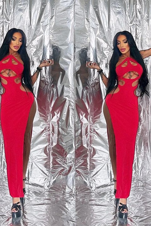 Entra in scena con un tocco di sensualità pura! Questo abito lungo aderente è un vero statement di stile, grazie ai suoi cut-out strategici che esaltano le forme con eleganza e audacia. Il design fasciante segue le curve, mentre il maxi spacco laterale aggiunge un tocco di grinta. Perfetto per serate glamour e occasioni speciali dove vuoi farti notare.