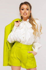 Dai energia al tuo outfit con questi shorts a vita alta in un vibrante verde lime. Il taglio sartoriale con pinces dona una silhouette elegante e strutturata, mentre la tonalità brillante li rende protagonisti assoluti del look. Ideali da abbinare a camicie in raso o blazer coordinati, sono perfetti per giornate di sole, eventi chic o aperitivi estivi. Comodi, stilosi e super versatili, non possono mancare nel tuo guardaroba di stagione.