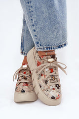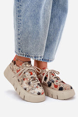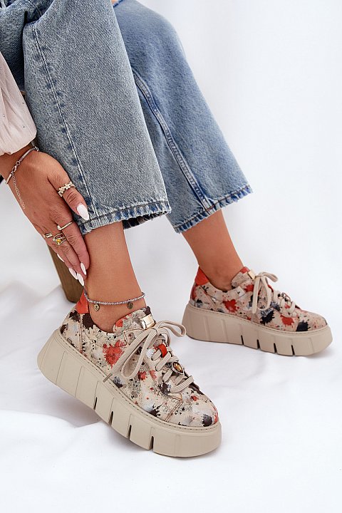 Rinnova il tuo stile con queste sneakers in pelle beige dal design urban e originale. La stampa effetto “paint splash” dona un tocco creativo e unico, mentre la suola platform chunky assicura comfort e slancio in ogni passo. Perfette con jeans o outfit streetwear, queste scarpe sono l'ideale per chi ama distinguersi con carattere e colore.