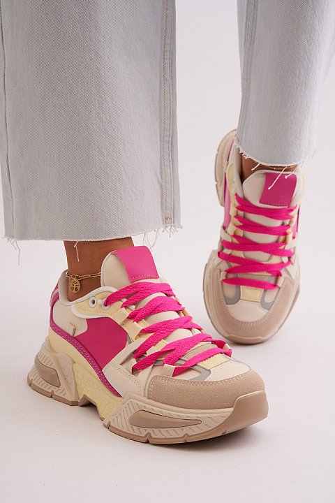 e Fuchsia Chunky Sneakers sono il mix perfetto tra comfort e tendenza. Con una base beige e dettagli fucsia fluo, queste scarpe sportive si distinguono per la suola spessa ultra moderna e le cuciture a contrasto. Perfette per dare carattere ai tuoi outfit quotidiani, dal jeans alla tuta streetwear.