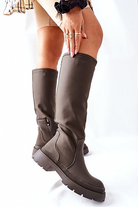 Stivali sotto al ginocchio in ecopelle con suola dentellata e tacco alto 4 cm.