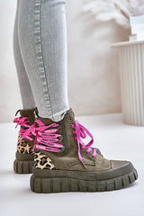 Anfibio da donna su piattaforma con lacci rosa vivaci e dettagli leopardati. Combina stile e comfort con questo design unico e grintoso, ideale per dare un tocco di originalità ai tuoi outfit quotidiani. Comfort assicurato grazie alla robusta suola