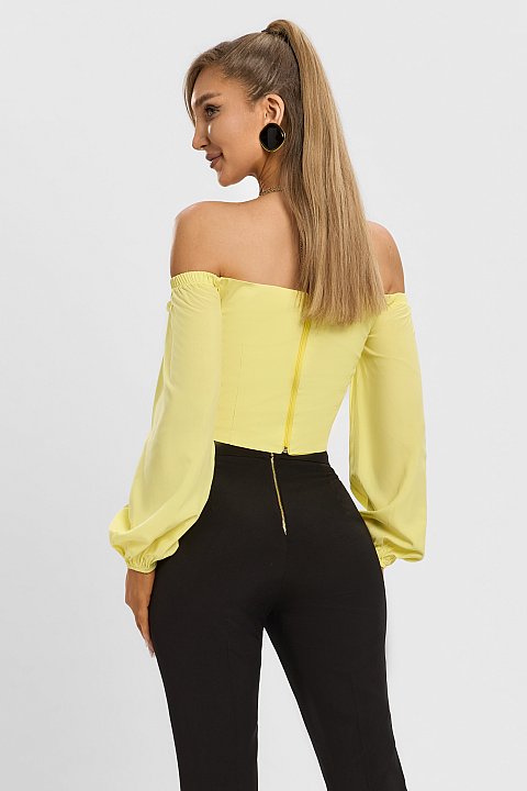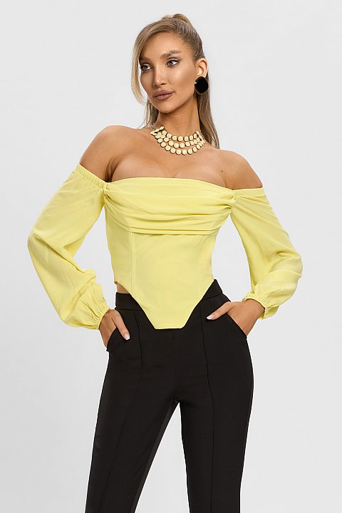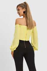 Esalta la tua femminilità con questo raffinato top corsetto giallo. Il design con spalle scoperte e maniche lunghe a sbuffo crea un effetto romantico e seducente, mentre la struttura sagomata valorizza la silhouette. Realizzato in tessuto leggero e confortevole, è perfetto per occasioni speciali o serate glamour. Abbinalo a pantaloni eleganti o gonne a vita alta per un look impeccabile e sofisticato.