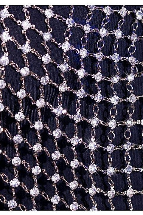 Elegante top gioiello composto da un intreccio di catene dorate con lucenti strass nei punti di giunzione e lungo le bretelle. Chiusura regolabile mediante gancetto. Metallo anallergico. Un idea originale per abbellire un abito o dare risalto al corpo con classe ed eleganza.