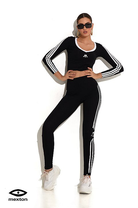 top a maniche lunghe stile bolero con strisce bianche a contrasto e scollo rotondo. Da abbinare ad un leggins o pantalone sportivo.