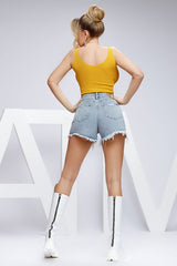 T-shirt color senape con spalline sottili. La lunghezza della maglia è di 35 cm.