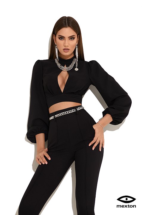 top nero slim fit, stile bolero con apertura a rombo sul petto. Colletto a lupetto, maniche lunghe e raccolte con spalline leggermente a sbuffo.