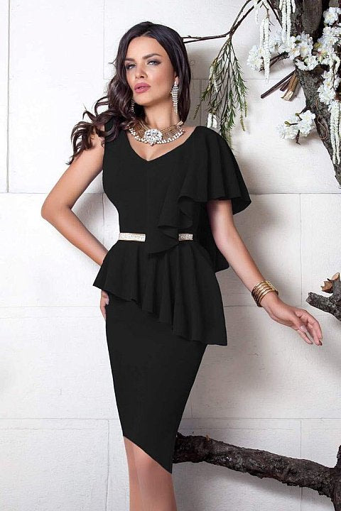 Tubino elegante nero con cinturino gioiello. Modello smanicato dalla vestibilità aderente con scollo a punta e fondo asimmetrico. Rouches profonde poste ad arricchire una spalla ed il punto vita.
