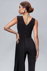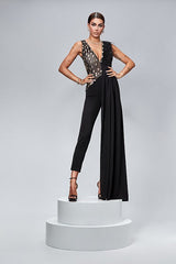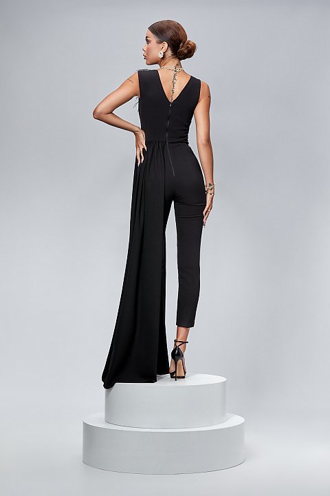 Raffinata ed elegante, questa tuta nera è perfetta per le occasioni speciali. Il design con scollo a V profondo è arricchito da un raffinato inserto in pizzo dorato e dettagli di piume su una spalla. La vestibilità aderente slancia la figura, mentre il drappeggio laterale conferisce un tocco di originalità e movimento. Il pantalone slim fit assicura un look moderno e chic, ideale da abbinare a tacchi alti e accessori luminosi. Un capo che unisce femminilità e classe per serate indimenticabili.