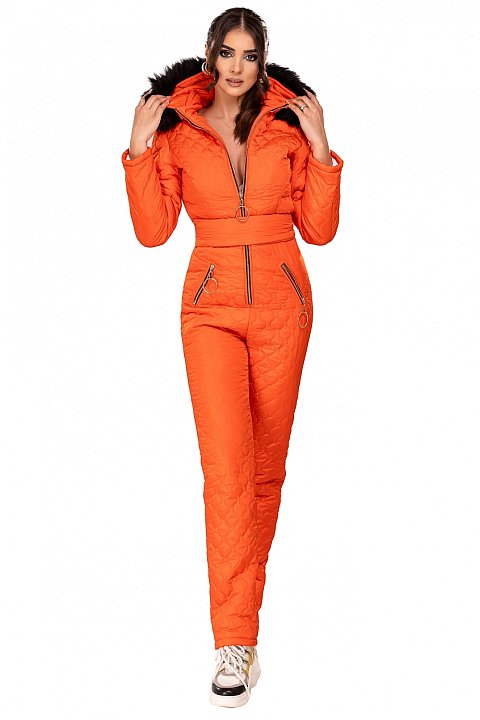 Tuta da sci calda e impermeabile con zip e tasche sul davanti. Il cappuccio con eco pelliccia e la cintura sono rimovibili.