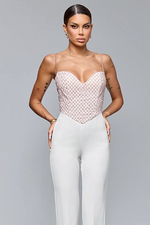 La parte superiore è costituita da un corpetto a bustier con spalline sottili, adornato da un motivo a rete che presenta piccoli dettagli in rilievo, simili a perline o pietre, che aggiungono luminosità e raffinatezza. Il corpetto crea un effetto sagomato sul busto, donando un look molto femminile e raffinato.