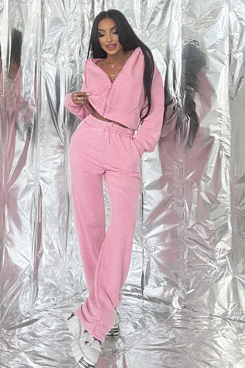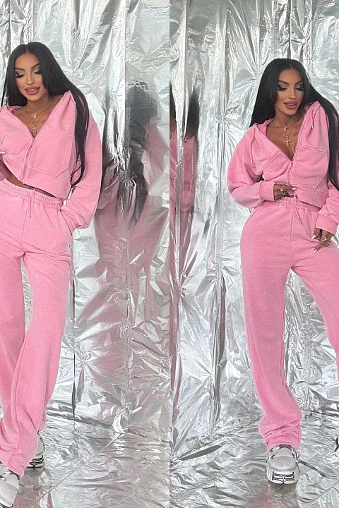 Aggiungi un tocco di dolcezza e stile con la tuta in velluto rosa. Il set include una felpa cropped con zip e cappuccio, perfetta per un look trendy, e pantaloni jogger a vita alta per una vestibilità comoda e versatile. Il tessuto vellutato e morbido dona un effetto elegante, rendendola ideale sia per il tempo libero che per un outfit streetwear di tendenza. Abbinala a sneakers platform per un look casual-chic!